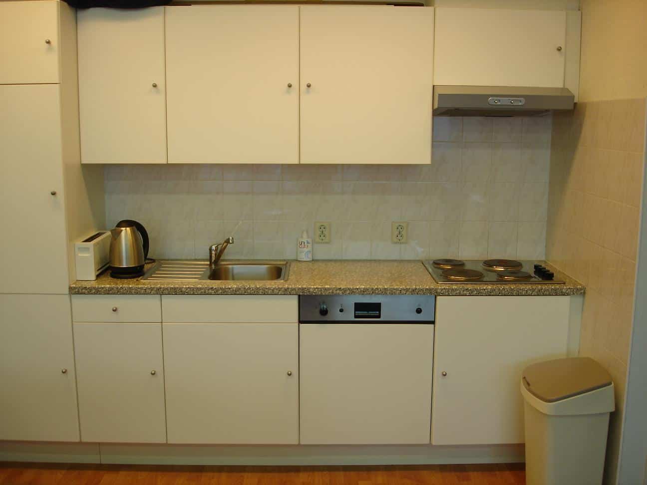 • keuken met zeer veel bergruimte en inbouwapparatuur zoals een koelkast, vaatwasser, 4-plaats elektrisch kooktoestel en afzuigkap.